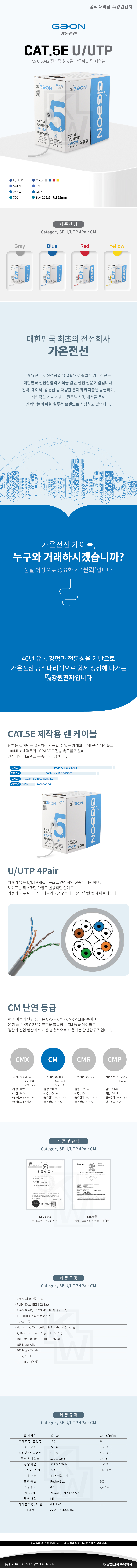 LAN-CAT-5E/CM, 직경 4.9mm, 카테고리5E, 1~100MHz, 24AWG, U/UTP, 단선, 4Pair, CM, KS C 3342 전기적 성능 만족, PoE+ 30W 지원