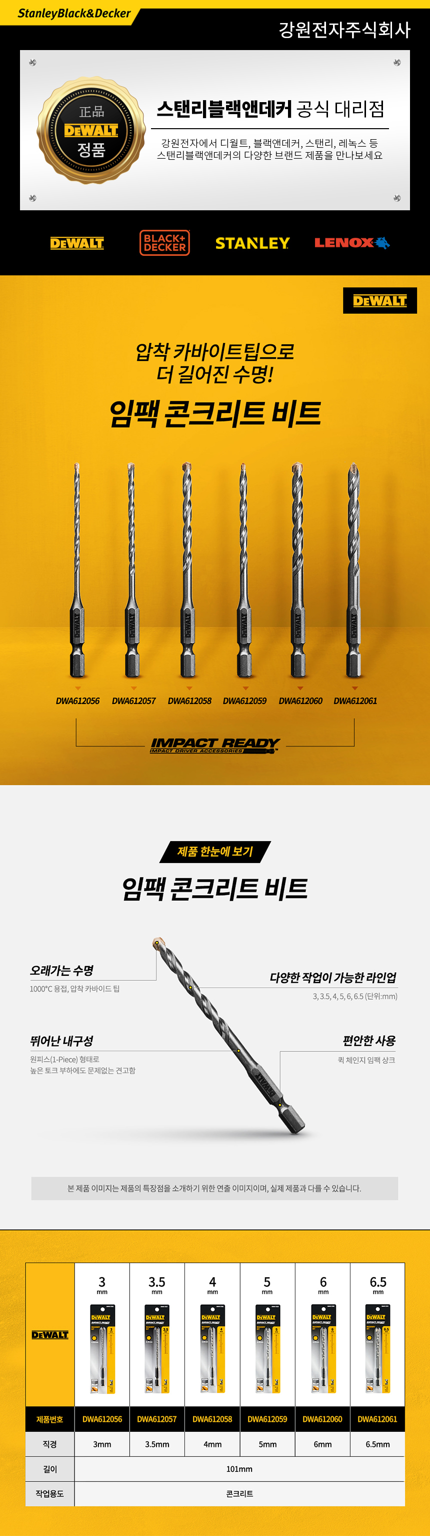 Dewalt, 임팩트드라이버, 임팩콘크리트비트, 임팩, 드릴비트, 기리, 비트, 콘크리트드릴비트, 콘크리트기리, 3.5mm