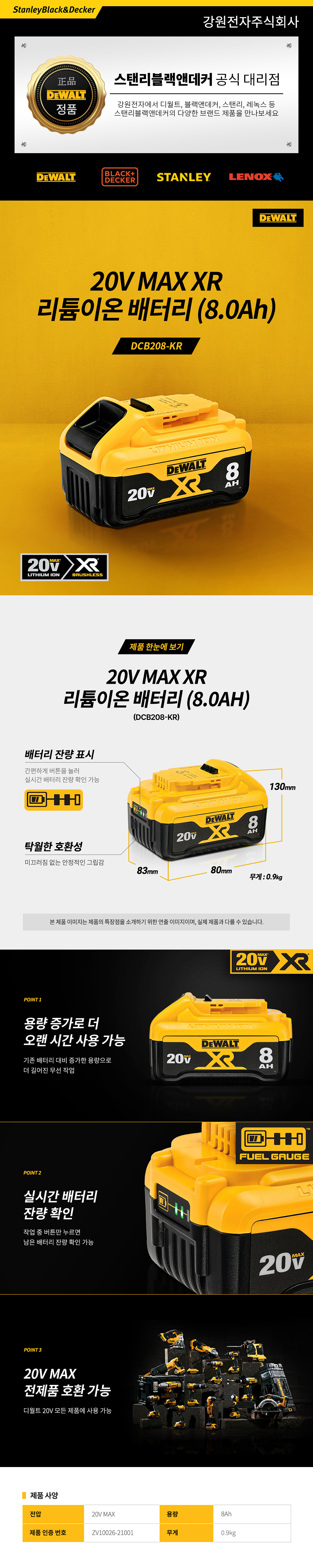 디월트 20V MAX 리튬이온 배터리(8.0Ah) DCB208-KR