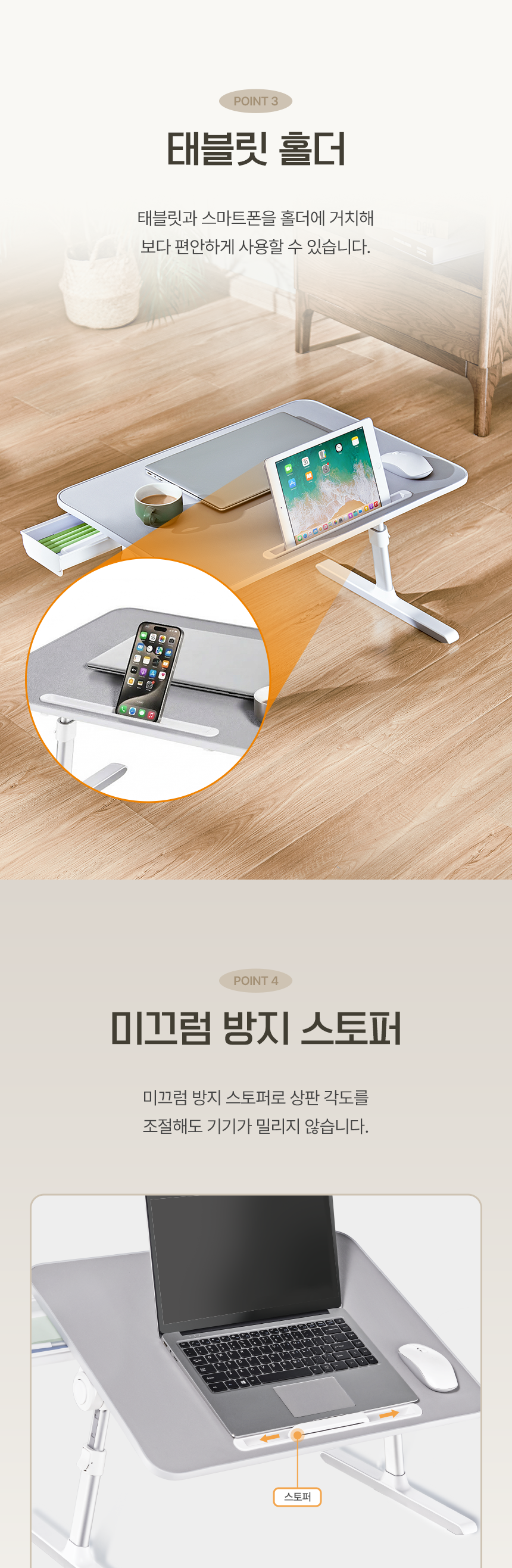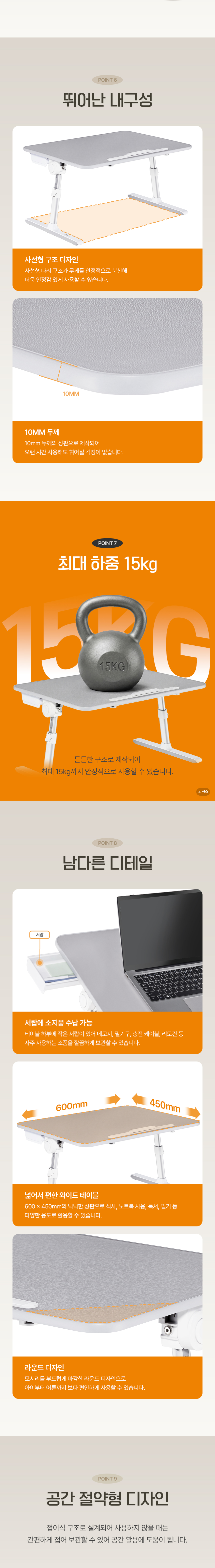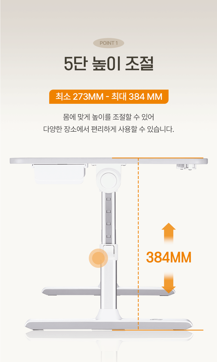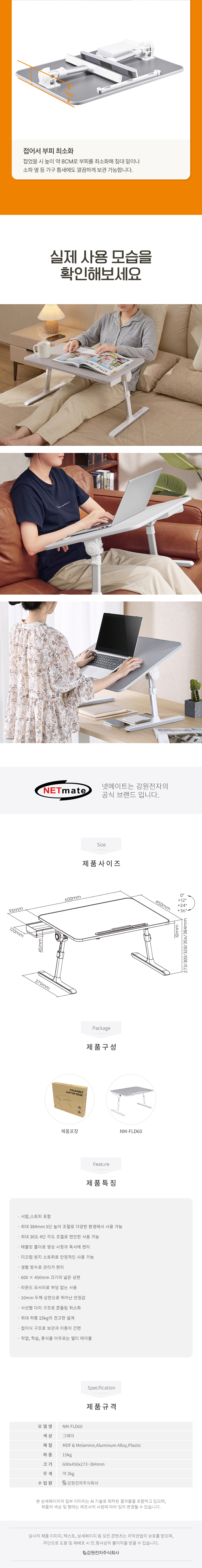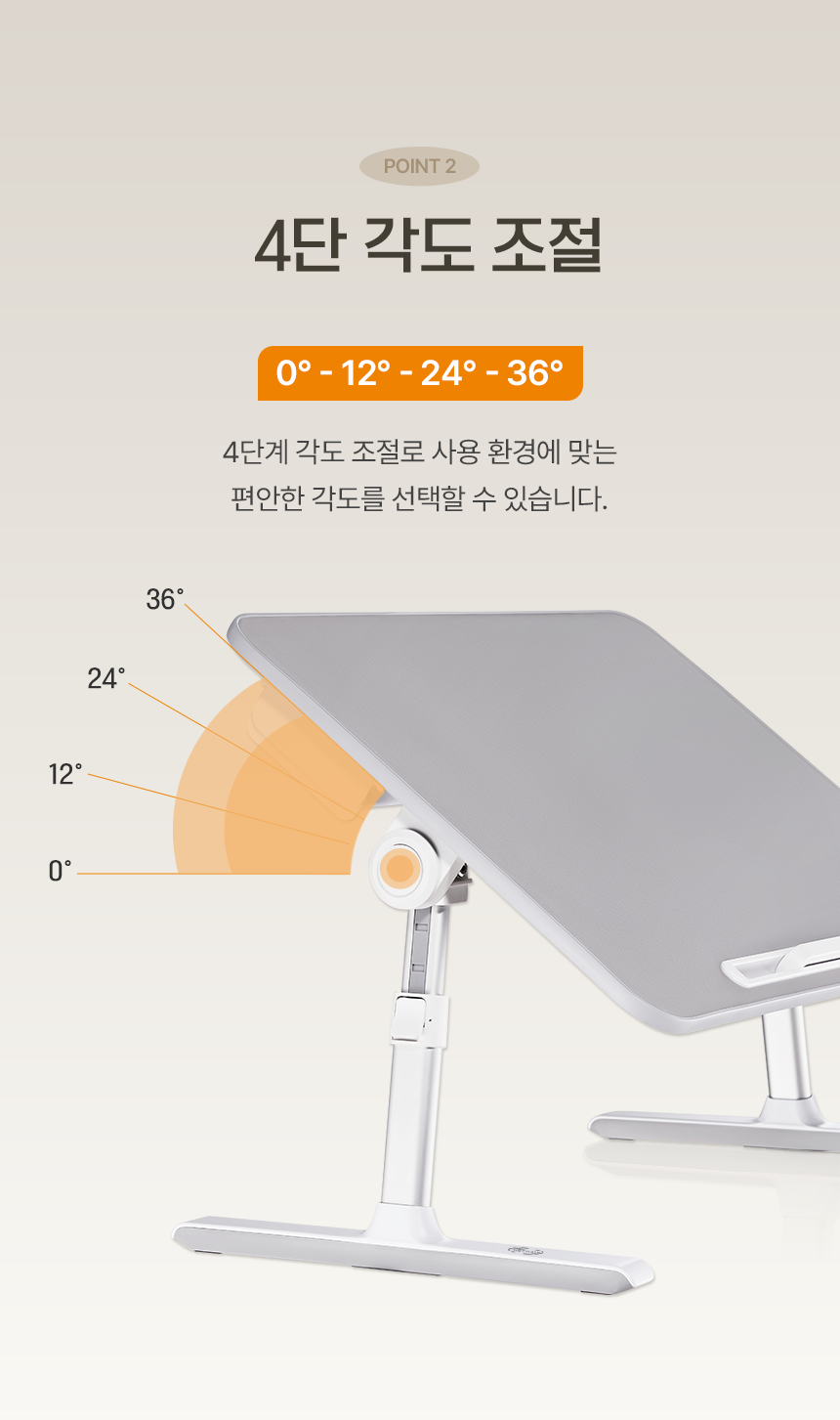 가로 60cm, 세로 45cm, 높이 27.3/30/32.8/35.6/38.4cm, 5단 높이 조절, 4단 각도 조절, 하중 15kg, 알루미늄/플라스틱 외
