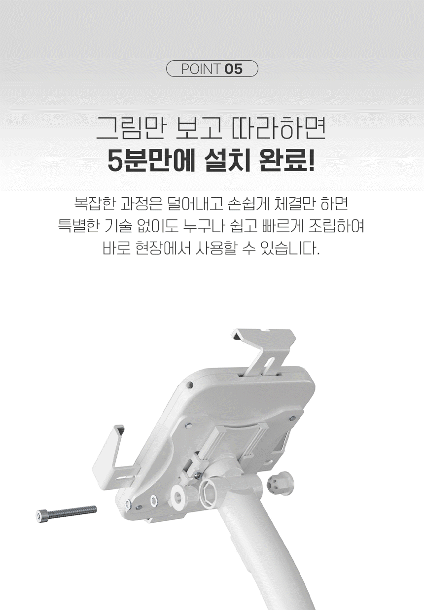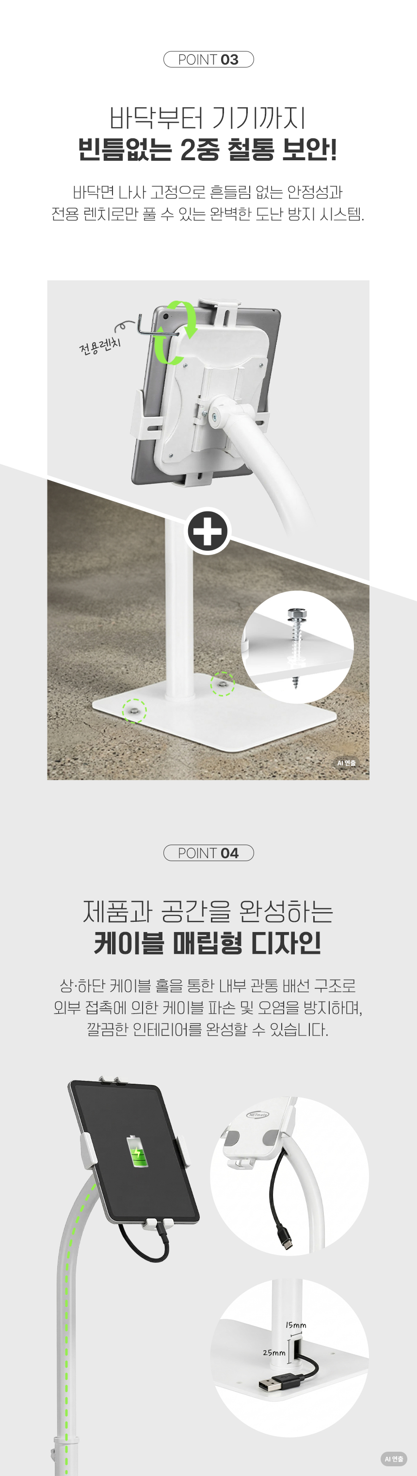 가로 129~181mm / 세로 200~246mm 기기 장착, 790~1190mm 높이 조절, 틸트(상하), 피벗(회전), 케이블정리(매립형), 도난방지