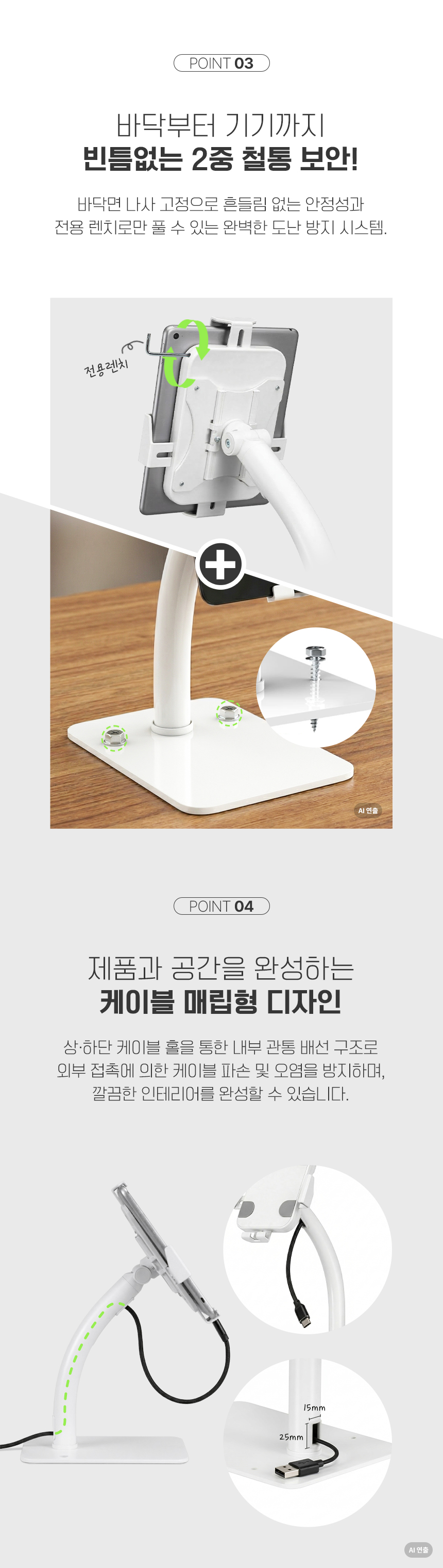 가로 129~181mm / 세로 200~246mm 기기 장착, 틸트(상하), 피벗(회전), 케이블정리(매립형), 도난방지