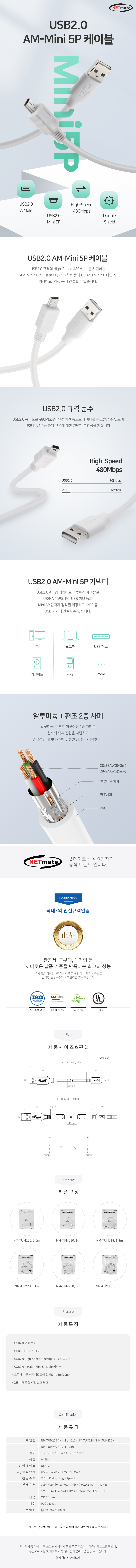 강원전자 넷메이트 USB2.0 AM-Mini 5핀 케이블 1m (화이트) NM-TUM210 NM-TUM210
