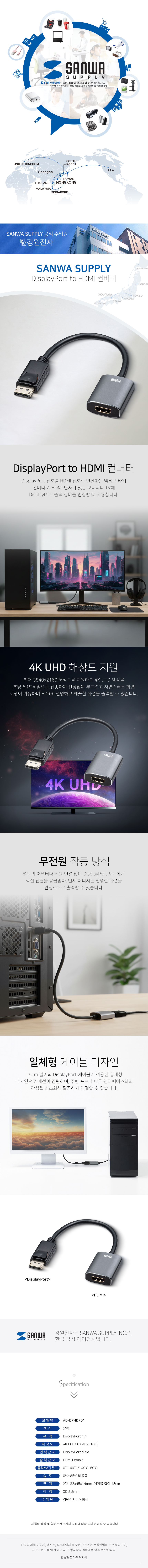 강원전자 산와서플라이 DP to HDMI 컨버터 AD-DPHDR01