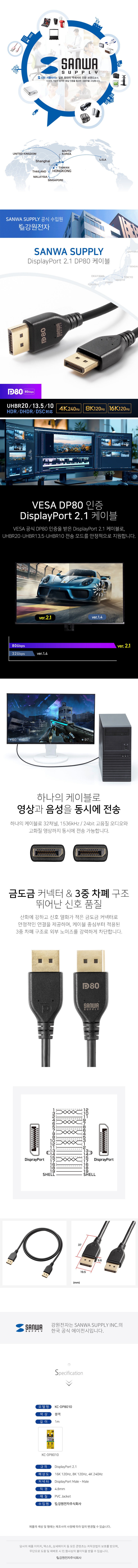 강원전자 산와서플라이 VESA 공식 인증 DisplayPort 2.1 DP80 케이블 1m KC-DP8010 KC-DP8010