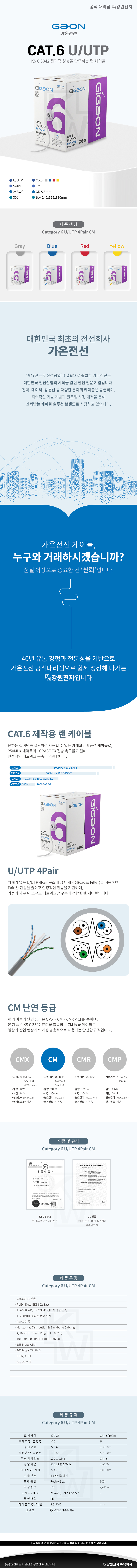 LAN-CAT-6/CM, 직경 5.6mm, 카테고리6, 1~250MHz, 24AWG, U/UTP, 단선, 4Pair, CM, KS C 3342 전기적 성능 만족, PoE+ 30W 지원