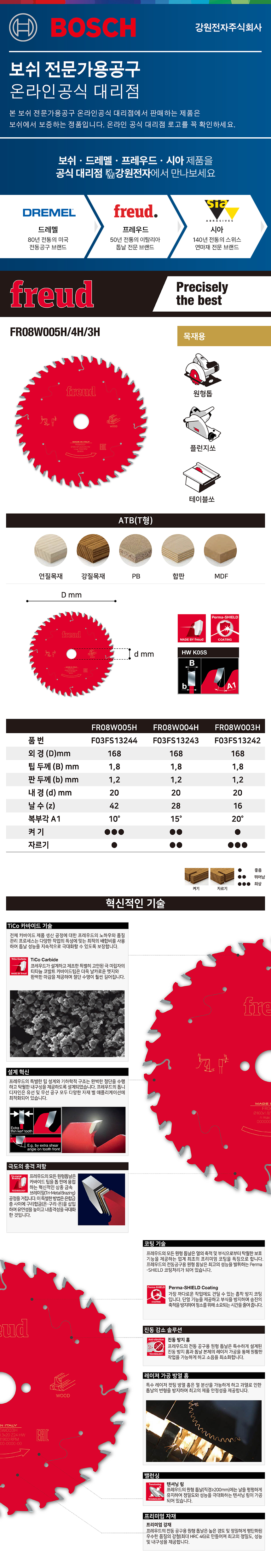 Bosch, freud, 외경 168mm, 팁두께 1.8mm, 판두께 1.2mm, 내경 20mm, 날수 T42, 팁모양 ATB(T형), 원형톱, 플런지쏘, 테이블쏘, 연질목재, 강질목재, PB, 합판, MDF
