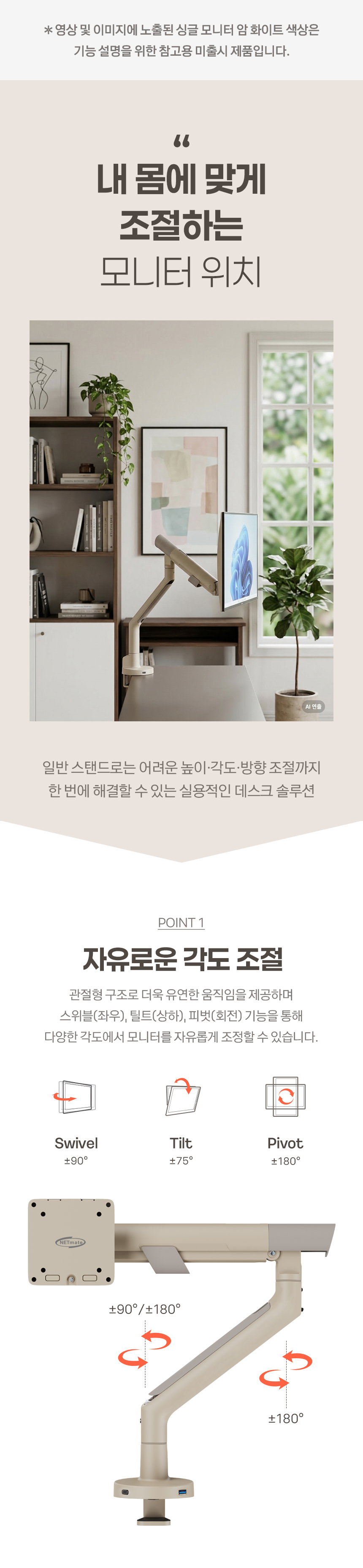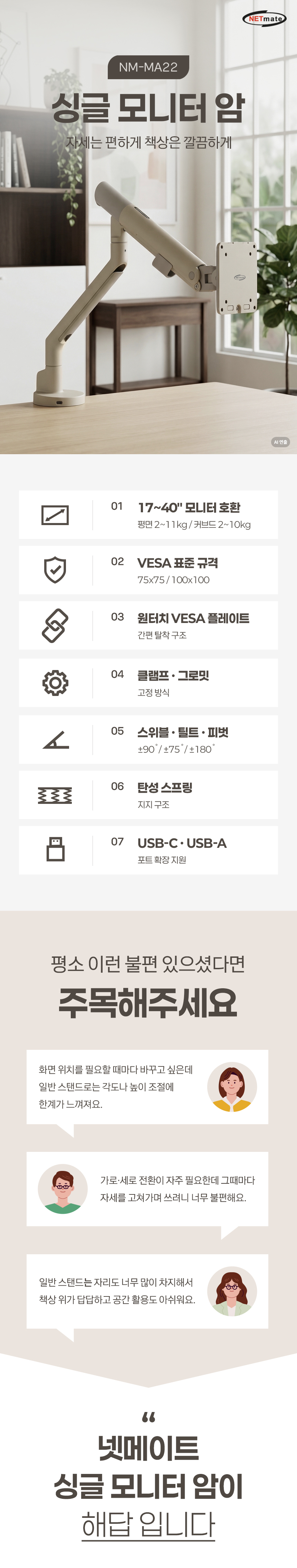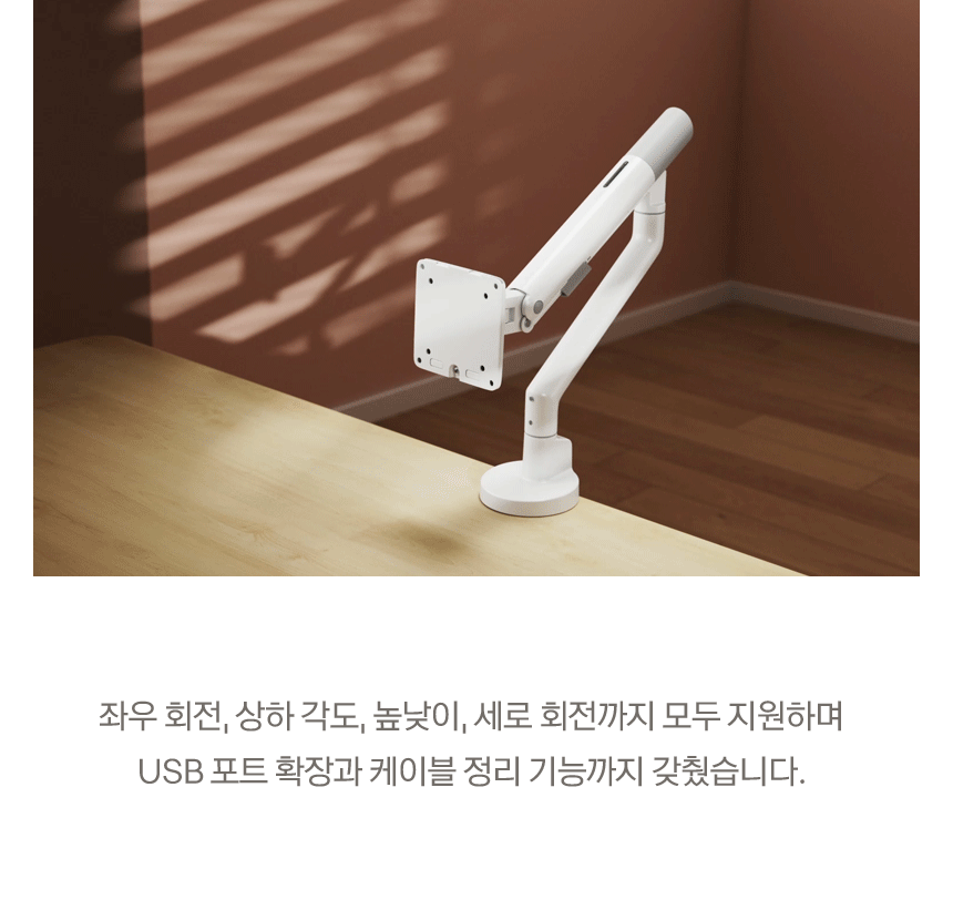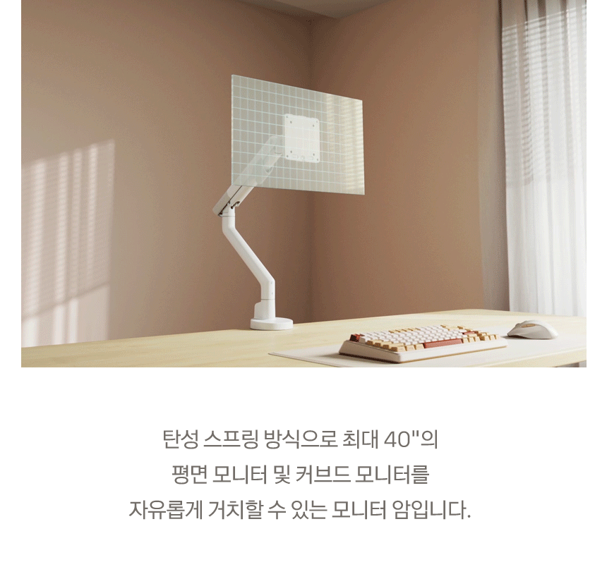싱글 모니터암, 커브드모니터, 대형모니터, 1대거치, 최대 40형/11kg이하 모니터 거치 가능, 클램프, 그로밋, 책상고정, VESA, 75x75, 100x100, 상하좌우, 스위블(좌우), 틸트(상하), 피벗(회전), 엘리베이션(높낮이), 케이블정리, 탄성스프링