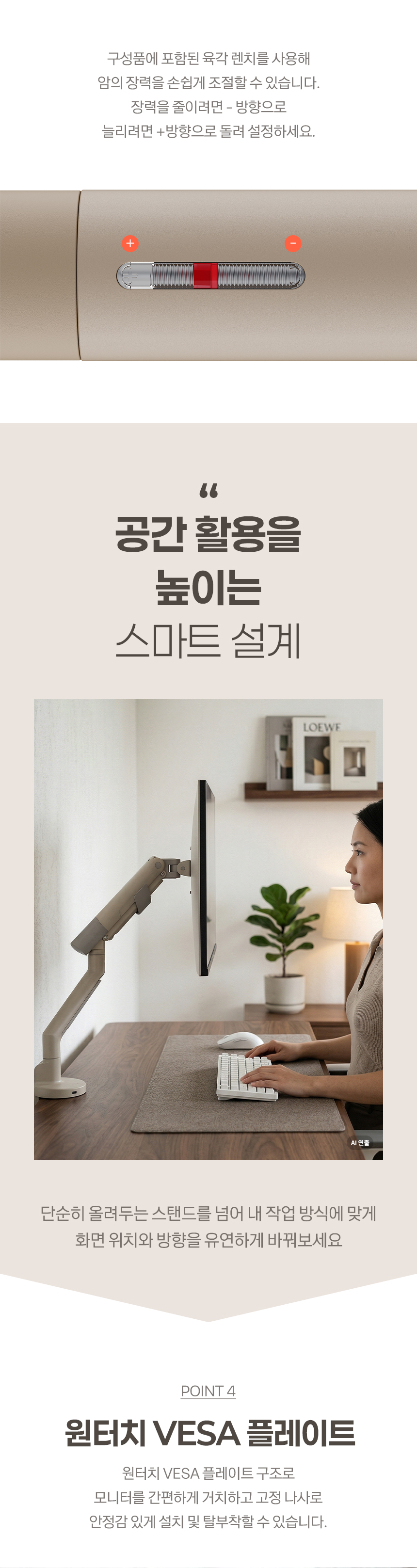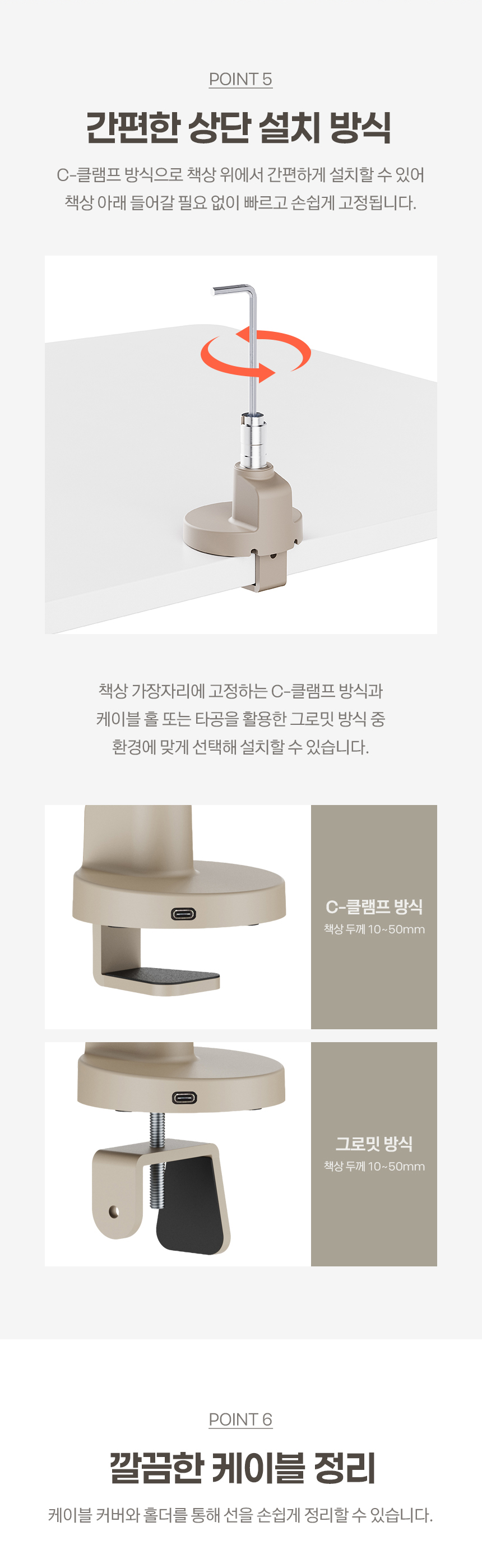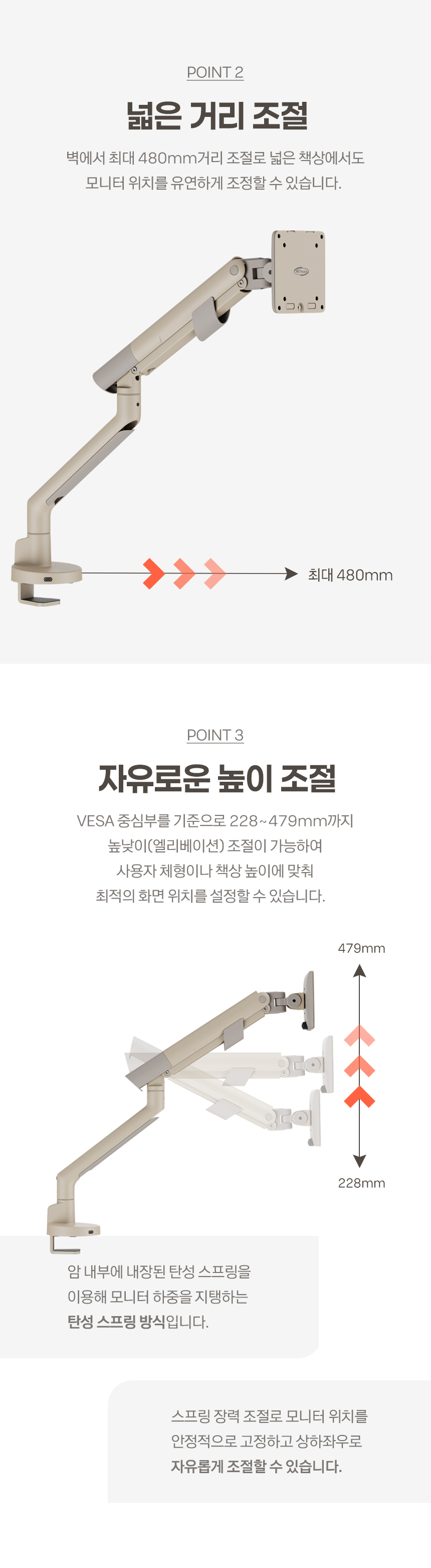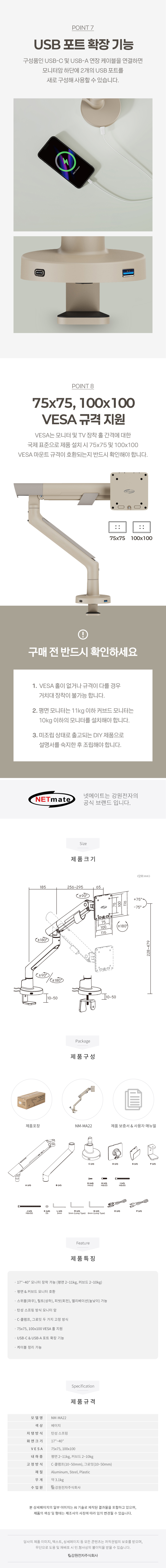 싱글 모니터암, 커브드모니터, 대형모니터, 1대거치, 최대 40형/11kg이하 모니터 거치 가능, 클램프, 그로밋, 책상고정, VESA, 75x75, 100x100, 상하좌우, 스위블(좌우), 틸트(상하), 피벗(회전), 엘리베이션(높낮이), 케이블정리, 탄성스프링