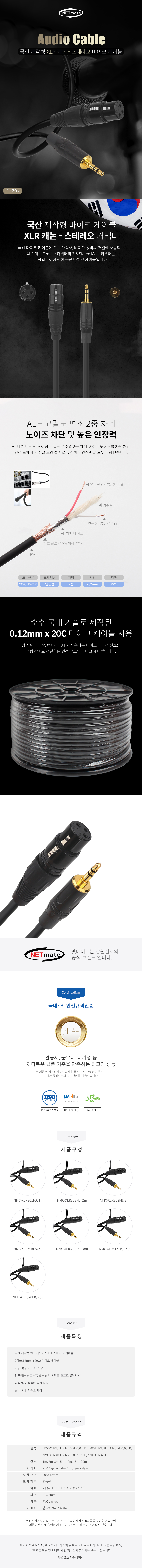 국산 제작형 XLR 캐논 - 3.5 Stereo 케이블 / 2심(0.12mm x 20C) 마이크 케이블 사용