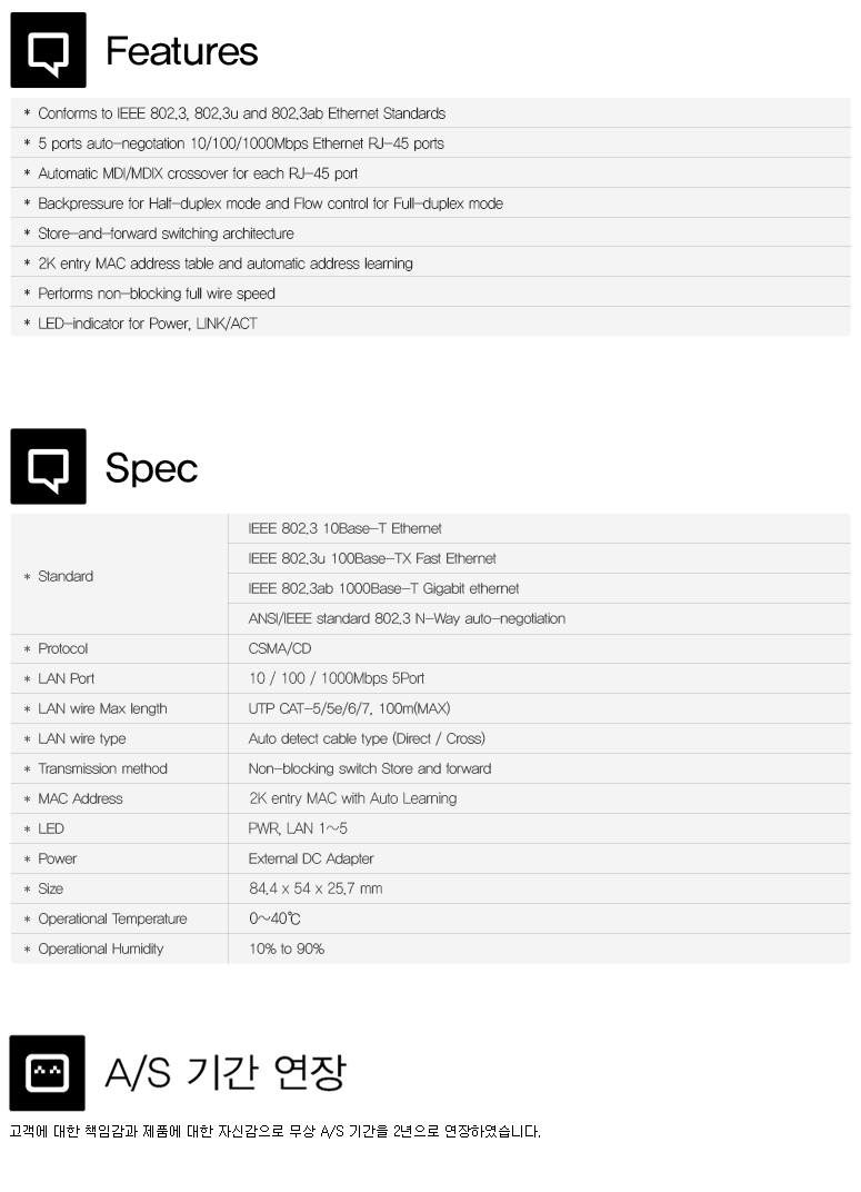 5포트 기가비트 허브, 10BASE-T, 100BASE-TX, 1000BASE-T, Jumbo Frame 9KByte
