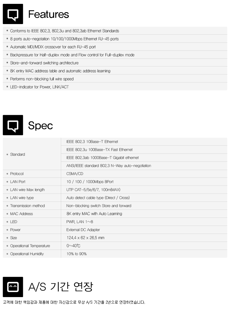 8포트 기가비트 허브, 10BASE-T, 100BASE-TX, 1000BASE-T, Jumbo Frame 9KByte