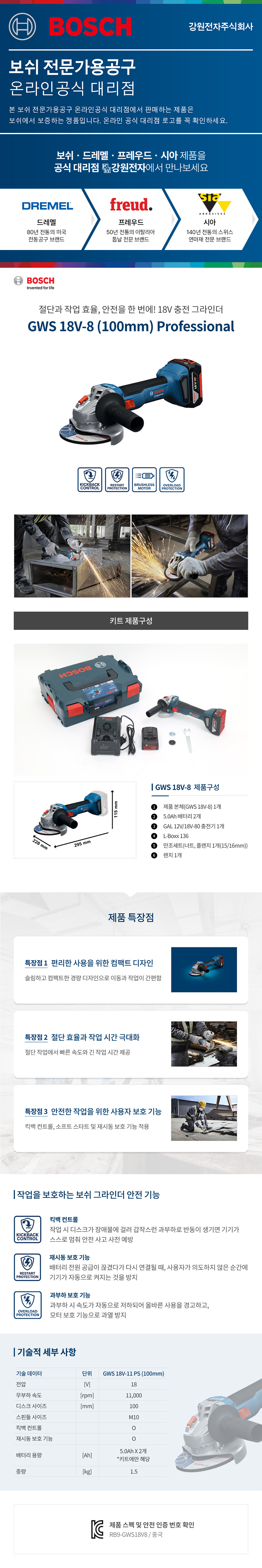 Bosch, 그라인더, 앵글그라인더, 무선그라인더, 충전그라인더, 800W, 100mm, 4인치, 키트, 세트