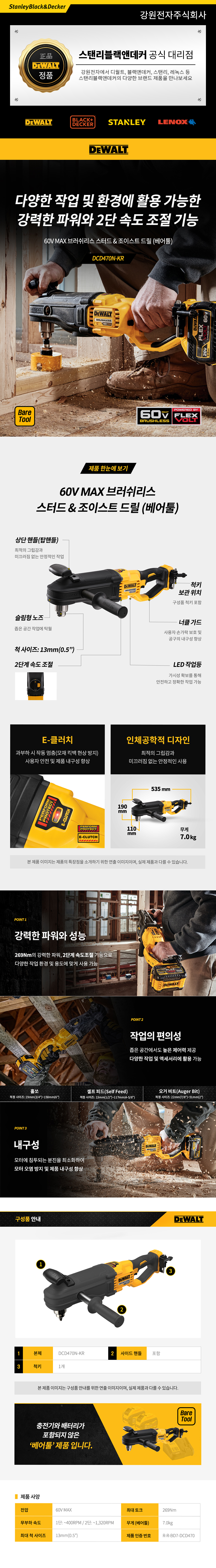 Dewalt, BL, 브러쉬리스, 60V, 앵글드릴, 조이스트드릴, 스터드드릴, 직각드릴