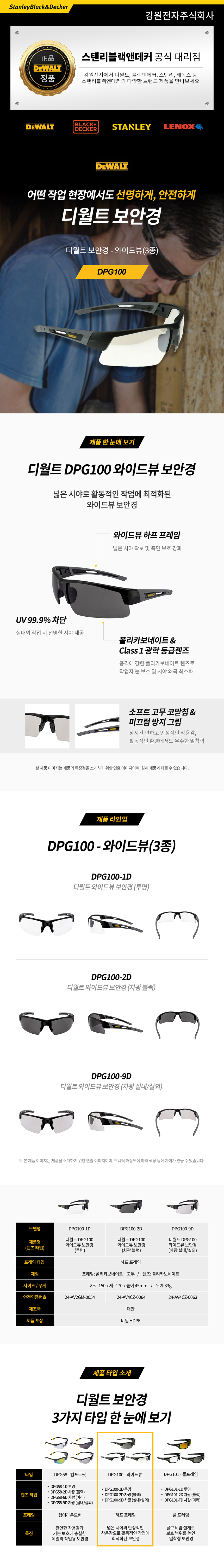 Dewalt, 와이드뷰 하프 프레임, 150x70x45mm, 33g, UV 99.9%차단, Class 1 광학 등급 렌즈, 소프트 고무 코받침, 프레임 다리 쿠션 패드