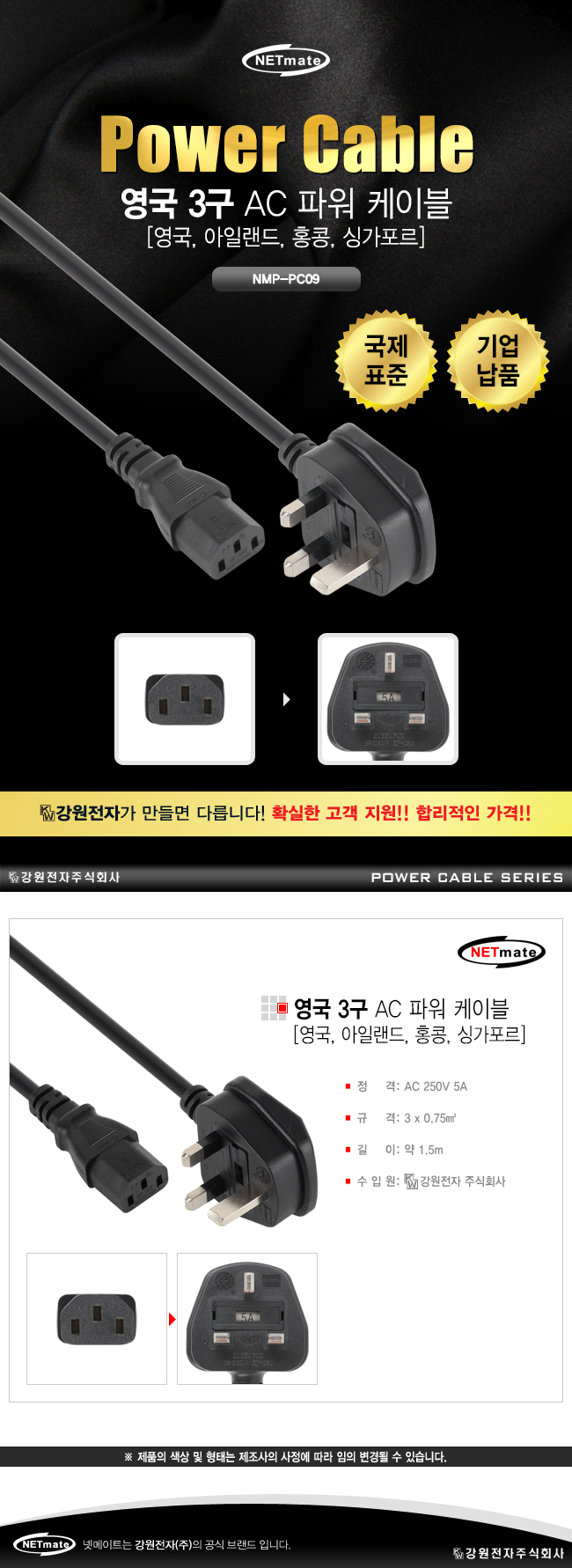 강원전자 넷메이트 NMP-PC09 ★국제표준규격★ 영국 3구 AC 파워 케이블 1.5m NMP-PC09